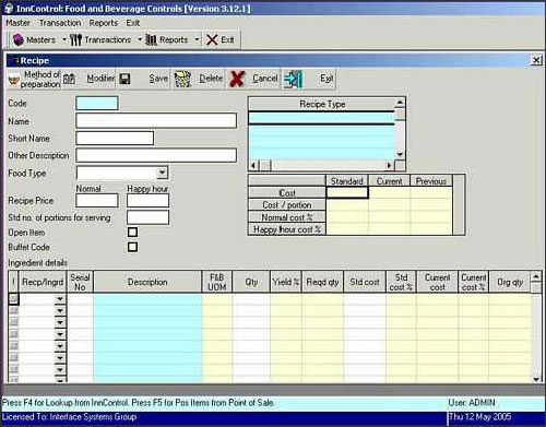 1:- Receipt Master : On this screen one can enter the receipe's for all the items. Based on these information the system can analyse the standard cost for items and hence give cost analysis report for the items as compared to the sales of the items.